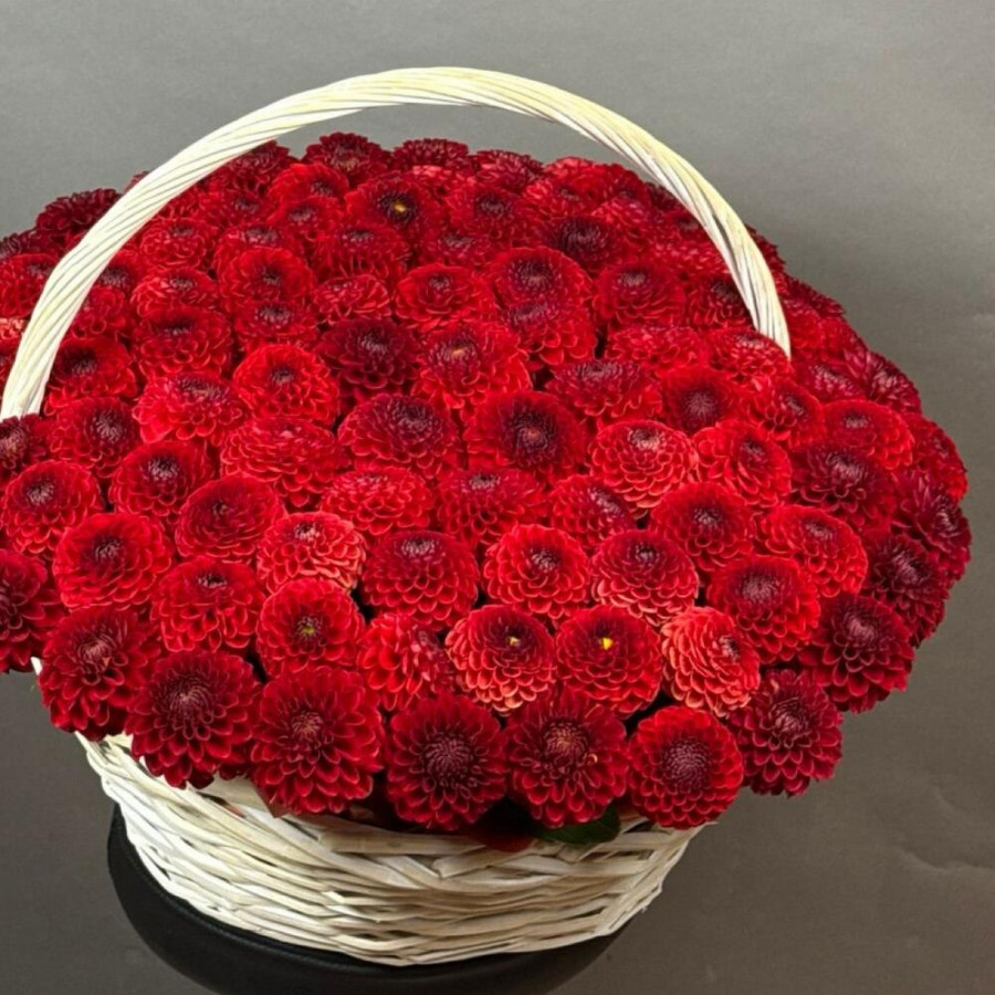 На фото композиция из 101 красной георгины в корзине. В составе: георгина 101 шт, оазис флористический 7 шт, корзина (xl) 1 шт, атласная лента 2 шт, . Все цветы свежие и ароматные, букет красиво оформлен и отлично подходит для подарка. Доступна доставка цветов или самовывоз.