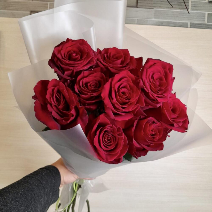 На фото букет из 9 бордовых роз. В составе: роза 9 шт, дизайнерская упаковка 1 шт, атласная лента 1 шт, . Все цветы свежие и ароматные, букет красиво оформлен и отлично подходит для подарка. Доступна доставка цветов или самовывоз.