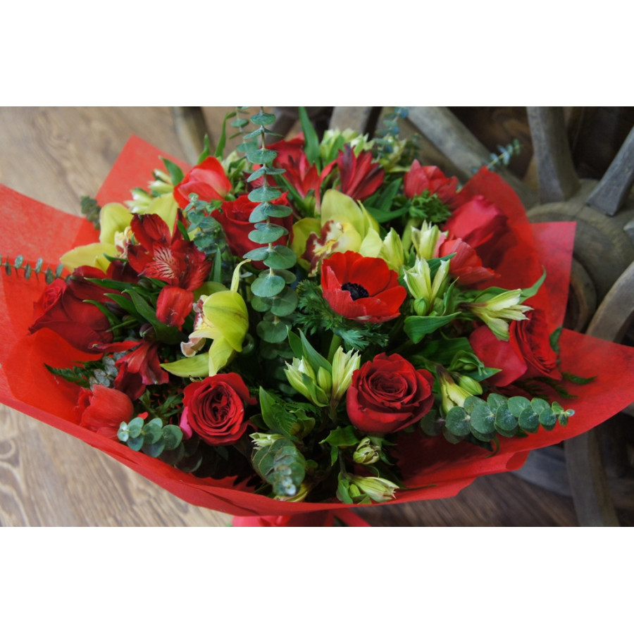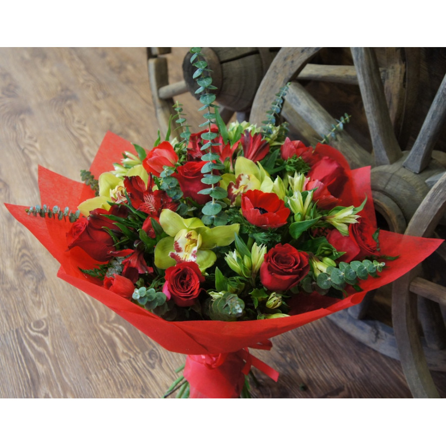 Когда хочется выразить свои душевные порывы, признаться в искренних чувствах, а слов не хватает, воспользуйтесь изысканной цветочной композицией, состоящей из пятнадцати роскошных роз, свежесрезанных орхидей, веточек эвкалипта и альстромерии. Оригинальное оформление в элегантной корзине, непревзойденное сочетание ароматов и цветов заменят любые слова и поступки, позволяя выразить всю Вашу любовь.