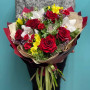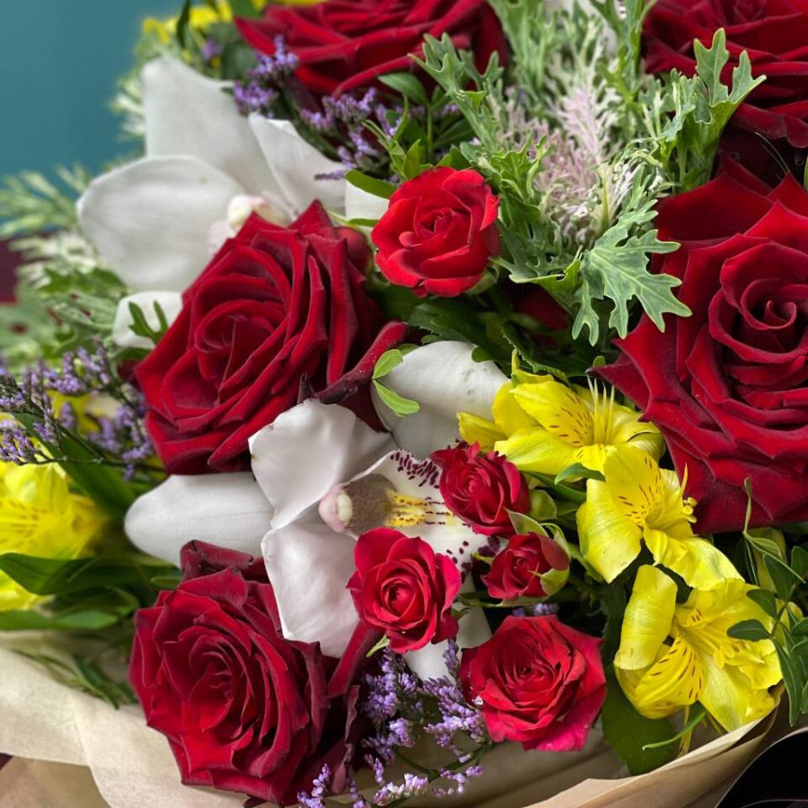 На фото букет из роз и орхидей. В составе: роза 5 шт, орхидея 3 шт, кустовая роза 3 шт, альстромерия 3 шт, брасика 2 шт, лимониум 2 шт, писташ 1 шт, . Все цветы свежие и ароматные, букет красиво оформлен и отлично подходит для подарка. Доступна доставка цветов или самовывоз.