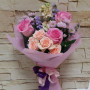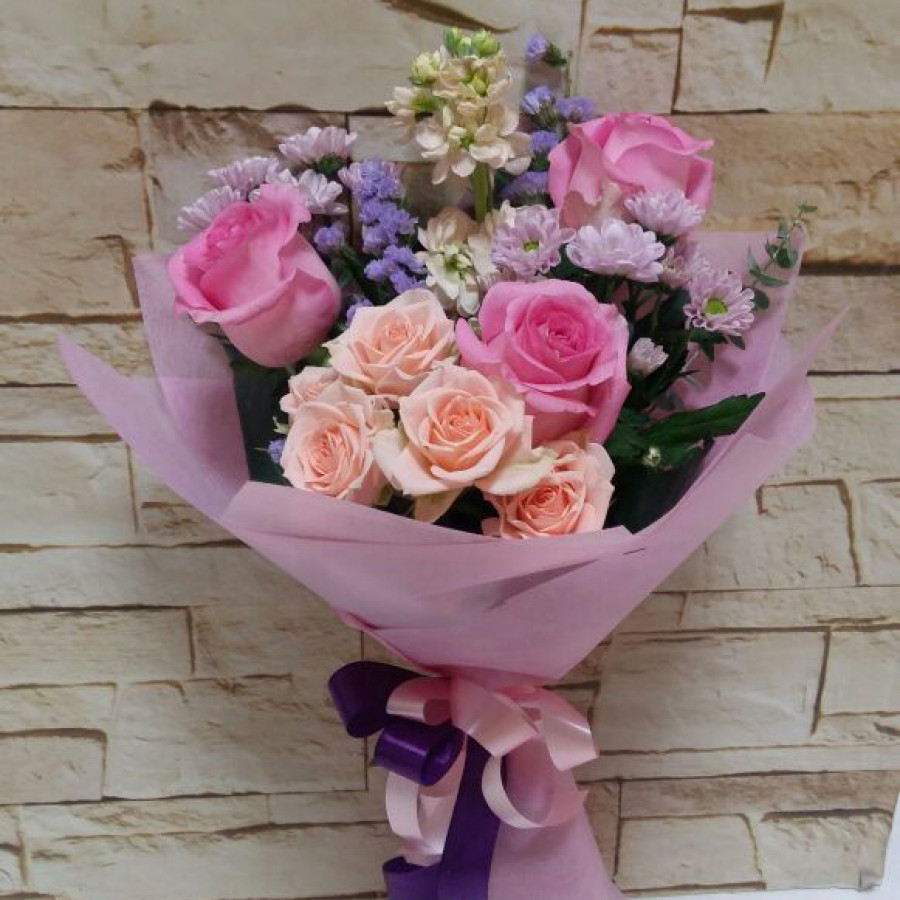 Нежный микс розовых кустовых роз, эквадорский роз, нежной лавандовой хризантемы, веточек статицы и маттиолы настолько хорошо сочетается друг с другом, что букет напоминает веселую утреннюю мелодию, которая без сомнений поднимет настроение получательнице на целый день!