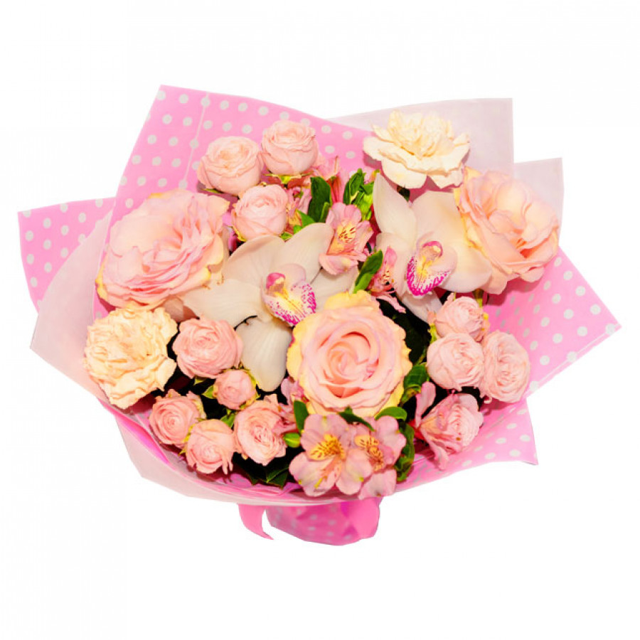 Нежное сочетание трех курпных одноголовых роз из Эквадора, трех веточек кустовых роз, двух величественных орхидей, двух игривых веточек альстромерий и двух гвоздичек розовых оттенков определённо станет приятным сюрпризом для получательницы и восхитят ее своей приятной воздушной гармонией.