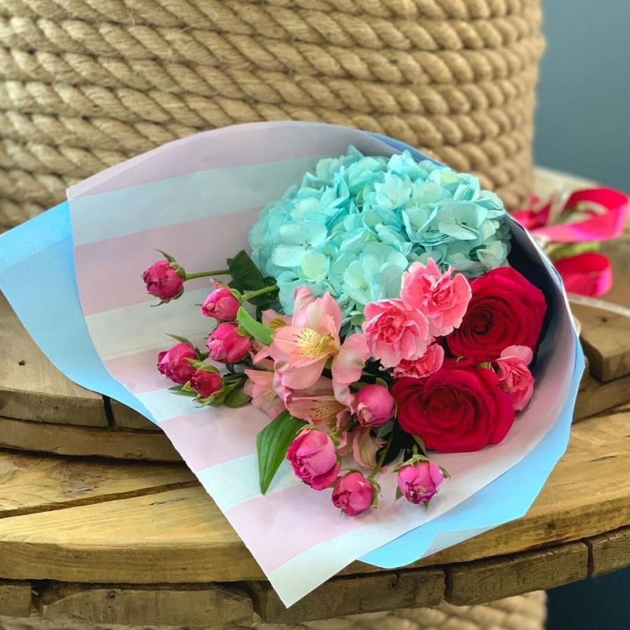 На фото маленький букет с гортензией. В составе: гортензия 1 шт, роза 2 шт, кустовая роза 2 шт, альстромерия 1 шт, гвоздика кустовая 1 шт, крафт-бумага 1 шт, атласная лента 1 шт, . Все цветы свежие и ароматные, букет красиво оформлен и отлично подходит для подарка. Доступна доставка цветов или самовывоз.