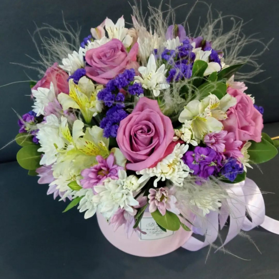 На фото розы, хризантемы и альстромерия в коробке. В составе: роза 5 шт, хризантема кустовая 4 шт, альстромерия 5 шт, статица 5 шт, колосья 2 шт, коробка (m) 1 шт, ваксфлауэр 1 шт, . Все цветы свежие и ароматные, букет красиво оформлен и отлично подходит для подарка. Доступна доставка цветов или самовывоз.